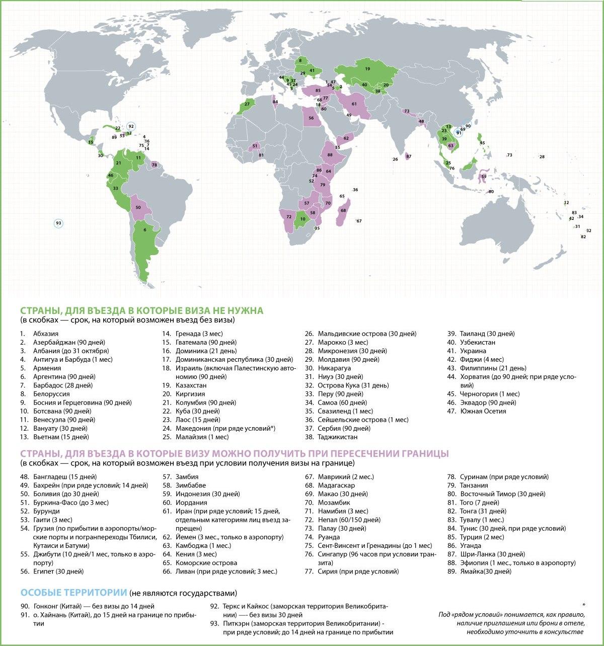 Если для въезда страну необходима виза, ее нужно оформить заранее. Если в пункт назначения вы добираетесь транзитом через территорию других государств, следует заранее проконсультироваться в турагентстве или консульских учреждениях стран, которые вы намереваетесь посетить проездом, относительно необходимости оформления транзитных виз, а также сроков их действия с учетом даты возвращения.